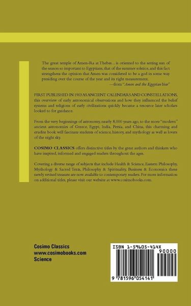 The great temple of Amen-Ra at Thebes... is oriented to the setting sun of the season so important to Egyptians, that of the summer solstice, and this fact strengthens the opinion that Amen was considered to be a god in some way presiding over the course of the year and its right measurement. -from "Amen and the Egyptian Year" First published in 1903 as Ancient Calendars and Constellations, this overview of early astronomical observations and how they influenced the belief systems and religions of early civilizations quickly became a resource later scholars looked to for guidance. From the very beginnings of astronomy, nearly 8,000 years ago, to the more "modern" ancient astronomies of Greece, Egypt, India, Persia, and China, this charming and erudite book will fascinate students of science, history, and mythology as well as lovers of the night sky.