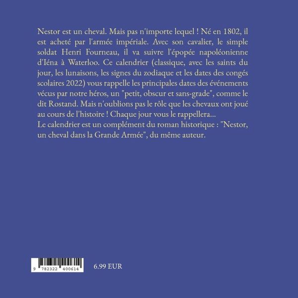 Nestor est un cheval. Mais pas n'importe lequel ! Né en 1802, il est acheté par l'armée impériale. Avec son cavalier, le simple soldat Henri Fourneau, il va suivre l'épopée napoléonienne d'Iéna à Waterloo. Ce calendrier (classique, avec les saints du jour, les lunaisons, les signes du zodiaque et les dates des congés scolaires 2022) vous rappelle les principales dates des événements vécus par notre héros, un "petit, obscur et sans-grade", comme le dit Rostand. Mais n'oublions pas le rôle que les chevaux ont joué au cours de l'histoire ! Chaque jour vous le rappellera...Le calendrier est un complément du roman historique : "Nestor, un cheval dans la Grande Armée", du même auteur.