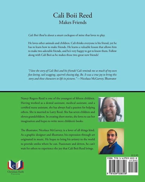 Cali Boii Reed is about a smart cockapoo of mine that loves to play. He loves other animals and children. Cali thinks everyone is his friend, yet he has to learn how to make friends. He learns a valuable lesson that allows him to make two adorable friends, and he's very happy to get to know them. Follow along with Cali Boii as he makes these two great new friends! I love the story of Cali Boii and his friends! Cali reminds me so much of my own fun-loving, tail-wagging, squirrel-chasing dog, Bo. It was a true joy to bring this story and these characters to life in pictures. --Nicolaus McGarvey, Illustrator