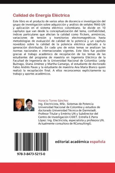 Este libro es el producto de varios años de docencia e investigación del grupo de investigación sobre adquisición y análisis de señales PAAS-UN y aplicación en el sistema eléctrico colombiano. Se divide en 10 capítulos que van desde la conceptualización del tema, confiabilidad, índices particulares que afectan la calidad como flickers, armónicos, variaciones de tensión y transitorios electromagnéticos hasta metodologías de evaluación de calidad de la potencia y un capítulo novedoso sobre la calidad de la potencia eléctrica aplicado a la generación distribuida. En cada uno de estos temas se analizan las normas nacionales e internacionales vigentes. Este libro fue posible gracias al trabajo académico de recopilación de los temas de las estudiantes del programa de maestría en Ingeniería Eléctrica de la Facultad de Ingeniería de la Universidad Nacional de Colombia: Leidy Buitrago, Diana Jiménez y Martha Camargo, el estudiante de doctorado Fabio Andrés Pavas y la estudiante de maestría Ana María Blanco quien realizó la recopilación final. A ellos reconocemos explícitamente su trabajo y aportes académicos.