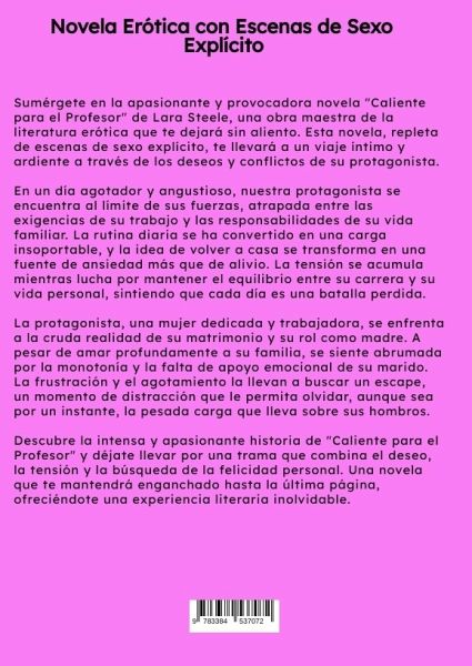 Sumérgete en la apasionante y provocadora novela "Caliente para el Profesor" de Lara Steele, una obra maestra de la literatura erótica que te dejará sin aliento. Esta novela, repleta de escenas de sexo explícito, te llevará a un viaje íntimo y ardiente a través de los deseos y conflictos de su protagonista.En un día agotador y angustioso, nuestra protagonista se encuentra al límite de sus fuerzas, atrapada entre las exigencias de su trabajo y las responsabilidades de su vida familiar. La rutina diaria se ha convertido en una carga insoportable, y la idea de volver a casa se transforma en una fuente de ansiedad más que de alivio. La tensión se acumula mientras lucha por mantener el equilibrio entre su carrera y su vida personal, sintiendo que cada día es una batalla perdida.La protagonista, una mujer dedicada y trabajadora, se enfrenta a la cruda realidad de su matrimonio y su rol como madre. A pesar de amar profundamente a su familia, se siente abrumada por la monotonía y la falta de apoyo emocional de su marido. La frustración y el agotamiento la llevan a buscar un escape, un momento de distracción que le permita olvidar, aunque sea por un instante, la pesada carga que lleva sobre sus hombros.En su desesperación, se encuentra en un bar, donde un atractivo desconocido le ofrece una bebida y una tentadora invitación a explorar sus deseos más profundos. La tensión sexual es palpable, y la protagonista se ve envuelta en una fantasía ardiente que promete liberarla de sus preocupaciones. Sin embargo, la realidad de sus responsabilidades y el miedo a las consecuencias la mantienen anclada a su vida actual, dejándola con un anhelo insatisfecho y una profunda reflexión sobre sus propios deseos y necesidades."Caliente para el Profesor" es una novela que no solo explora la pasión y el deseo, sino también los conflictos internos y las luchas personales de una mujer en busca de su propia identidad y satisfacción. Con una narrativa cautivadora y escenas de sexo explícito que te dejarán sin aliento, esta obra de Lara Steele es una lectura imperdible para los amantes del género erótico.Descubre la intensa y apasionante historia de "Caliente para el Profesor" y déjate llevar por una trama que combina el deseo, la tensión y la búsqueda de la felicidad personal. Una novela que te mantendrá enganchado hasta la última página, ofreciéndote una experiencia literaria inolvidable.