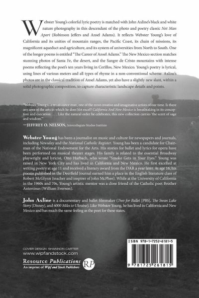 Webster Young's colorful lyric poetry is matched with John Axline's black and white nature photography in this descendant of the photo and poetry classic Not Man Apart (Robinson Jeffers and Ansel Adams). It reflects Webster Young's love of California and its unities of mountain ranges, the Pacific Coast, its chain of missions, its magnificent aqueduct and agriculture, and its system of universities from North to South. One of the longer poems is entitled ""The Career of Ansel Adams."" The New Mexico section matches stunning photos of Santa Fe, the desert, and the Sangre de Cristo mountains with intense poems reflecting the poet's ten years living in Cerillos, New Mexico. Young's poetry is lyrical, using lines of various meters and all types of rhyme in a non-conventional scheme. Axline's photos are in the classical tradition of Ansel Adams, yet also have a slightly new slant, within a solid photographic composition, to capture characteristic landscape details and points.
