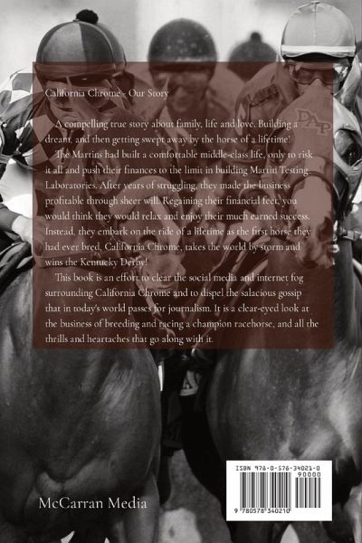 California Chrome - Our Story A compelling true story about family, life and love. Building a dream, and then getting swept away by the horse of a lifetime! The Martins had built a comfortable middle-class life, only to risk it all and push their finances to the limit in building Martin Testing Laboratories. After years of struggling, they made the business profitable through sheer will. Regaining their financial feet, you would think they would relax and enjoy their much earned success. Instead, they embark on the ride of a lifetime as the first horse they had ever bred, California Chrome, takes the world by storm and wins the Kentucky Derby! This book is an effort to clear the social media and internet fog surrounding California Chrome and to dispel the salacious gossip that in today's world passes for journalism. It is a clear-eyed look at the business of breeding and racing a champion racehorse, and all the thrills and heartaches that go along with it.