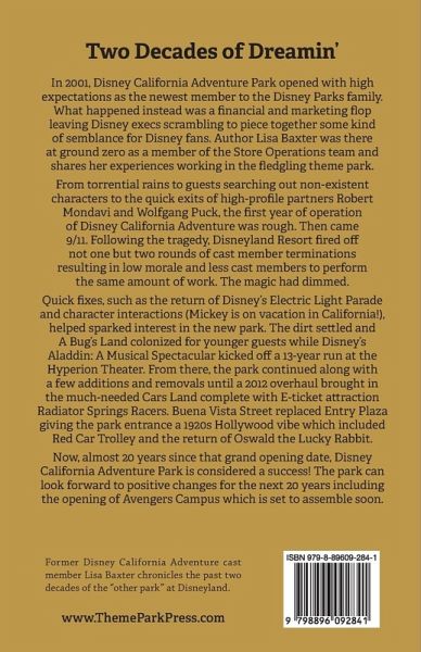 Two Decades of Dreamin' In 2001, Disney California Adventure Park opened with high expectations as the newest member to the Disney Parks family. What happened instead was a financial and marketing flop leaving Disney execs scrambling to piece together some kind of semblance for Disney fans. Author Lisa Baxter was there at ground zero as a member of the Store Operations team and shares her experiences working in the fledgling theme park. From torrential rains to guests searching out non-existent characters to the quick exits of high-profile partners Robert Mondavi and Wolfgang Puck, the first year of operation of Disney California Adventure was rough. Then came 9/11. Following the tragedy, Disneyland Resort fired off not one but two rounds of cast member terminations resulting in low morale and less cast members to perform the same amount of work. The magic had dimmed. Quick fixes, such as the return of Disney's Electric Light Parade and character interactions (Mickey is on vacation in California!), helped sparked interest in the new park. The dirt settled and A Bug's Land colonized for younger guests while Disney's Aladdin: A Musical Spectacular kicked off a 13-year run at the Hyperion Theater. From there, the park continued along with a few additions and removals until a 2012 overhaul brought in the much-needed Cars Land complete with E-ticket attraction Radiator Springs Racers. Buena Vista Street replaced Entry Plaza giving the park entrance a 1920s Hollywood vibe which included Red Car Trolley and the return of Oswald the Lucky Rabbit. Now, almost 20 years since that grand opening date, Disney California Adventure Park is considered a success. The park can look forward to positive changes for the next 20 years including the opening of Avengers Campus which is set to assemble soon.