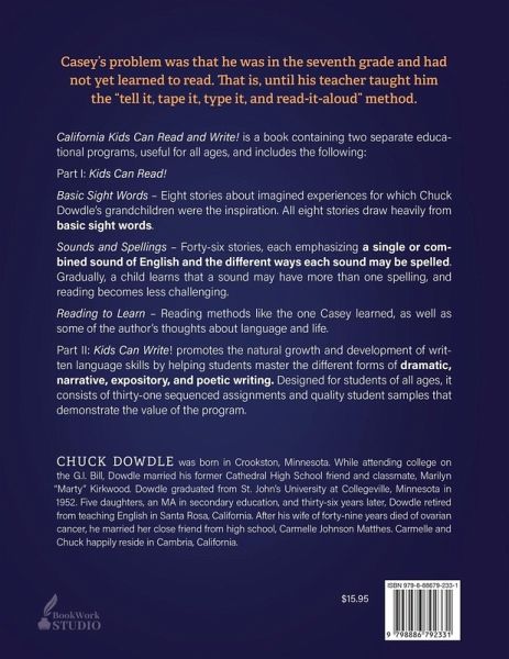 Casey's problem was that he was in the seventh grade and had not yet learned to read. That is, until his teacher taught him the "tell it, tape it, type it, and read-it-aloud" method. California Kids Can Read and Write! is a book containing two separate educational programs, useful for all ages, and includes the following: Part I: Kids Can Read! Basic Sight Words - Eight stories about imagined experiences for which Chuck Dowdle's grandchildren were the inspiration. All eight stories draw heavily from basic sight words. Sounds and Spellings - Forty-six stories, each emphasizing a single or combined sound of English and the different ways each sound may be spelled. Gradually, a child learns that a sound may have more than one spelling, and reading becomes less challenging. Reading to Learn - Reading methods like the one Casey learned, as well as some of the author's thoughts about language and life. Part II: Kids Can Write! promotes the natural growth and development of written language skills by helping students master the different forms of dramatic, narrative, expository, and poetic writing. Designed for students of all ages, it consists of thirty-one sequenced assignments and quality student samples that demonstrate the value of the program.