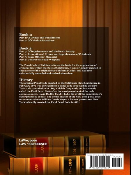 The Penal Code of California forms the basis for the application of criminal law within the state of California. It was originally enacted in 1872 as one of the original four California Codes, and has been substantially amended and revised since then. This book contains the following parts: Part 1 - Of Crimes and Punishments, Part 2 - Of Criminal Procedure