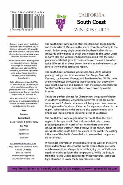 Our easy to use and comprehensive winery guide that has no equal. We believe you're the best critic, so we provide you with the most essential and up-to-date information for each winery, so you can make your own wine touring and tasting decisions. The South Coast wine region stretches from San Diego County and the border of Mexico on the south to Ventura County in the north. Today, every single county in Southern California has vineyards and wineries to check out. Visitors to the South Coast region's 250 wineries should keep in mind that the wine grape varietals that grow in cooler areas on the coast are often quite different than those grown in warm inland valleys-so be sure to try wineries across the region! The South Coast American Viticultural Area (AVA) includes grape-growing areas in six counties: San Diego, Riverside, Ventura, Los Angeles, Orange, and San Bernardino. While there are microclimates throughout these counties that depend on your exact elevation and distance from the ocean, generally the South Coast boasts warm weather cooled down by coastal breezes. This is the perfect climate for Chardonnay, the grape of choice in Southern California. Zinfandel also thrives in the area, and some very old Zinfandel vines are still being used. You can also find high-quality Syrah and Cabernet Sauvignon produced in the region. Winemakers in the area are also experimenting with Rhone and Iberian grapes like other areas of California. The South Coast wine region is further south than the wine regions in Europe, and in fact is closer in latitude to wine-producing regions in North Africa. While there are some vineyards in the warmer, inland valleys in the region, most vineyards in the South Coast are closer to the coast. The cooling influence of the Pacific Ocean helps to ensure that the grapes do not dry out. While most vineyards in the region are to the west of the Sierra Pelona Mountains, closer to the Pacific Ocean, there are some notable exceptions. Vineyards in this hot, dry part of California need something to lower the temperature. While the breeze from the Pacific Ocean does this for most vineyards, some use high elevation to lower the temperature instead.