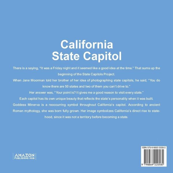 There is a saying, "It was a Friday night and it seemed like a good idea at the time." That sums up the beginning of the State Capitols Project. When Jane Moorman told her brother of her idea of photographing state capitols, he said, "You do know there are 50 states and two of them you can't drive to." Her answer was, "Your point is? It gives me a good reason to visit every state." Each capitol has its own unique beauty that reflects the state's personality when it was built. Goddess Minerva is a reoccurring symbol throughout California's capitol. According to ancient Roman mythology, she was born fully grown. Her image symbolizes California's direct rise to statehood, since it was not a territory before becoming a state.