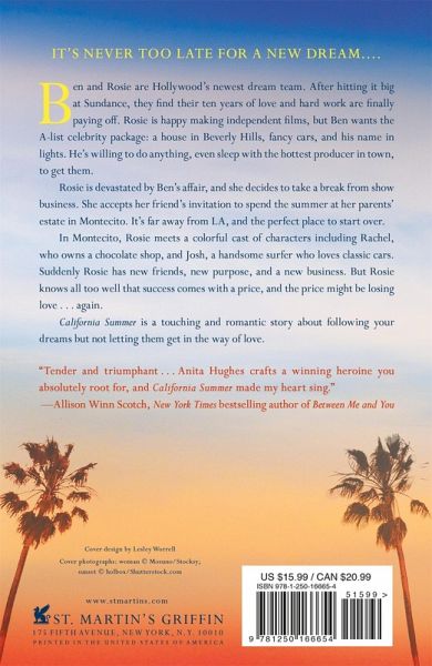 "The perfect beach read!" -Mary Alice Monroe, New York Times bestselling author of Beach House Reunion. "Tender and triumphant...California Summer made my heart sing." -Allison Winn Scotch, New York Times bestselling author of Between Me and You Anita Hughes's California Summer is a charming and beautiful love story about a former Hollywood producer who trades her cast list in for cookbooks in the hopes of following her dreams and finding new love. Ben and Rosie are Hollywood's newest director/producer dream team. After hitting it big at Sundance, it seems that their ten years of love and hard work are finally paying off. Rosie is happy making independent films, but Ben wants the A-List celebrity package: a house in Beverly Hills, fancy cars in the driveway, and his name on the biggest blockbusters. He's willing to do anything, even sleep with the most famous producer in town, to get them. Rosie is devastated by Ben's affair, and she decides to take a break from show business. She accepts her best friend's invitation to spend the summer at her parents' estate in Montecito. It's far away from L.A., the perfect place to start over. In Montecito, Rosie meets a colorful cast of characters including Rachel, who owns a chocolate shop, and Josh, a handsome local who splits his time between surfing and classic cars. Suddenly Rosie has new friends and a new purpose. She starts a business in the village, and her luck seems to be turning around. But Rosie knows all too well that success comes with a price, and the price might be losing love...again. California Summer is a touching and romantic story about following your dreams but not letting them get in the way of love.