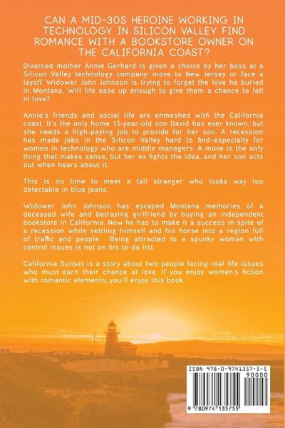Annie is afraid to lose everything she knows. John is starting over after his wife's death. Can they find their way together? As a divorced mother, Annie Gerhard’s friends and social life are enmeshed with the California coast. It’s the only home her 15-year-old son David has ever known and his father lives there, but she needs a high-paying job to maintain their lifestyle. A recession has made jobs in the Silicon Valley hard to find—especially for a woman in technology. Does she need to move somewhere else to give her son the future she wants him to have? Widower John Johnson has escaped Montana memories of a deceased wife and betraying girlfriend by buying an independent bookstore in California. Now he has to make it a success in spite of a recession while settling himself and his horse into a region full of traffic and people. Being attracted to a spunky woman with control issues is not on his to-do list. California Sunset is a story about two people facing real life issues who must earn their chance at love. If you enjoy women’s fiction with romantic elements, you’ll enjoy this book. Buy California Sunset, the first book in the California Romance Series, and settle down for a comfortable read. (Warning: This story is an abuse survivor romance and may trigger people who have suffered.)
