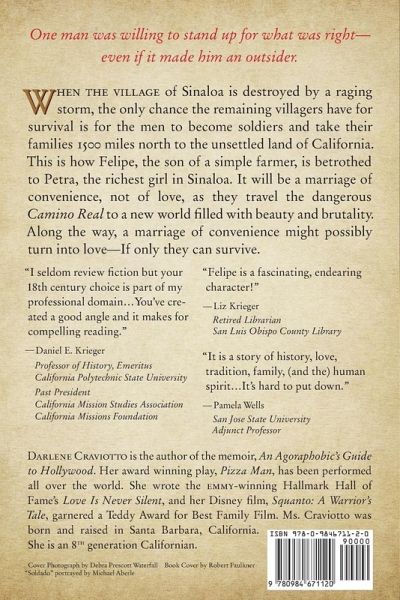 When the village of Sinaloa is destroyed by a raging storm, the only chance the remaining villagers have for survival is for the men to become soldiers and take their families 1500 miles north to the unsettled land of California.This is how Felipe, the son of a simple farmer, is betrothed to Petra, the richest girl in Sinaloa. It will be a marriage of convenience, not of love, as they travel the dangerous Camino Real to a new world filled with beauty and brutality. Along the way, a marriage of convenience might possibly turn into love-If only they can survive.