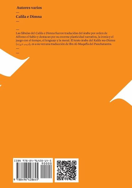 Calila e Dimna es probablemente uno de los textos literarios más antiguos de la narrativa universal. Su fuente más remota conocida hasta la fecha es el Panchatantra hindú, aparecido hacia el año 300. En el 540 se tradujo al pahlavi o persa literario, y poco después al sirio. El iraní Ibn Al-Muqaffa lo tradujo después al árabe con el título de Kalila wa-Dimna, en el siglo XIII. Fue este el texto que por encargo de Alfonso X fue traducido al romance de la Castilla de su tiempo. Las fábulas del Calila e Dimna destacan por su enorme plasticidad narrativa, la ironía y el juego con el tiempo, el lenguaje y la moral. Calila y Dimna, los personajes que dan título a la obra, son dos zorros que protagonizan gran parte de las historias contenidas en el libro. La obra está constituida por una serie de cuentos educativos -o exempla- escritos a la manera de fábulas que conforman una estructura muy repetida en la narrativa medieval, parecida a la del posterior Libro de Patronio o Conde Lucanor, escrito por el infante don Juan Manuel. Se trata, por tanto, de lo que se conoce como un manual para la educación de príncipes. La finalidad de la obra es la de instruir al lector sobre cómo comportarse en la vida privada y en la vida pública, otorgando especial relevancia a la relación con los otros. Edición establecida y prologada por Antonio García Solalinde.