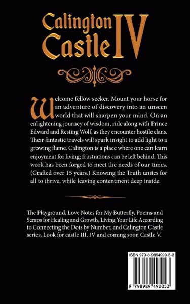 Welcome fellow seeker. Mount your horse for an adventure of discovery into an unseen world that will sharpen your mind. On an enlightening journey of wisdom, ride along with Prince Edward and Resting Wolf, as they encounter hostile clans. Their fantastic travels will spark insight to add light to a growing flame. Calington is a place where one can learn enjoyment for living; frustrations can be left behind. This work has been forged to meet the needs of our times. (Craft ed over 15 years.) Knowing the Truth unites for all to thrive, while leaving contentment deep inside. The Playground, Love Notes for My Butterfly, Poems and Scraps for Healing and Growth, Living Your Life According to Connecting the Dots by Number, and Calington Castle series. Look for castle III, IV and coming soon Castle V.