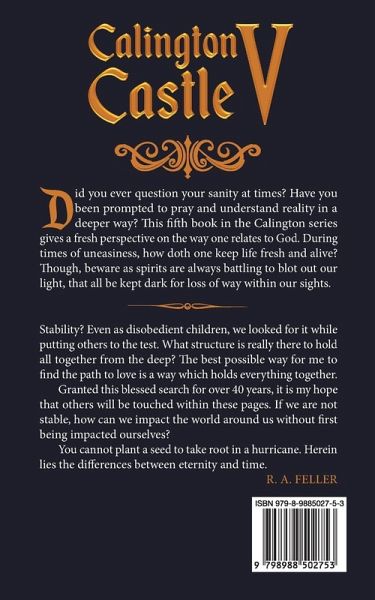 Did you ever question your sanity at times? Have you been prompted to pray and understand reality in a deeper way? This fifth book in the Calington series gives a fresh perspective on the way one relates to God. During times of uneasiness, how doth one keep life fresh and alive? Th ough, beware as spirits are always battling to blot out our light, that all be kept dark for loss of way within our sights. Stability? Even as disobedient children, we looked for it while putting others to the test. What structure is really there to hold all together from the deep? The best possible way for me to find the path to love is a way which holds everything together. Granted this blessed search for over 40 years, it is my hope that others will be touched within these pages. If we are not stable, how can we impact the world around us without first being impacted ourselves? You cannot plant a seed to take root in a hurricane. Herein lies the differences between eternity and time. R. A. FELLER
