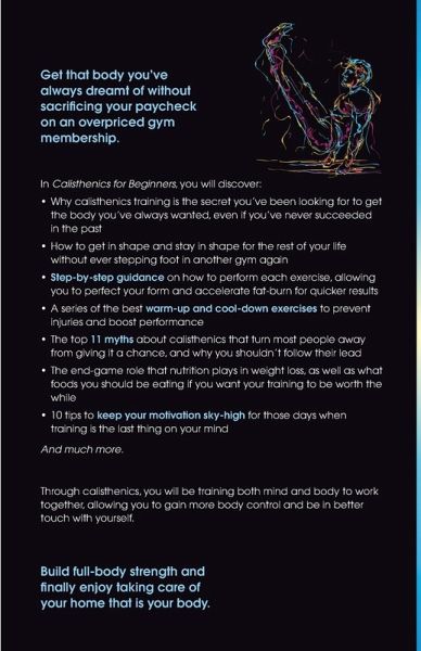 Get that body you've always dreamt of without sacrificing your paycheck on an overpriced gym membership. Are you tired of paying a ridiculous amount of money to your gym without actually having the urge to go there? Do you get frustrated by the jungle-like nature of the gym, just wanting to be able to workout anywhere, anytime, with little to no equipment needed for your training? Are you looking for a way to reach what seems to be a near-impossible task: you love what you see in the mirror, are confident in your own skin, and actually find it fun to workout? If you answered 'yes' to any of the above questions, then you and calisthenics training will get along quite well. Working out seems to get more complicated as the years go by, with new trendy equipment popping up in ads claiming to burn 10x the number of calories than 'regular' ways of exercising. Not only will getting this equipment be at the dispense of your hard-earned money that you could be spending elsewhere, like for groceries or special occasions, but it will also take up space in your home and create unnecessary clutter. Calisthenics is a type of strength training that involves using only your bodyweight and combines strength, balance, mobility, and flexibility for the ultimate at-home training tool, so that you can get in shape without the hassle of going to the gym or buying fancy machinery. But as with starting any new program, you'll need to get the know-how of it all before jumping straight in. In Calisthenics for Beginners, you will discover: ¿ Why calisthenics training is the secret you've been looking for to get the body you've always wanted, even if you've never succeeded in the past ¿ How to get in shape and stay in shape for the rest of your life without ever stepping foot in another gym again ¿ Step-by-step guidance on how to perform each exercise, allowing you to perfect your form and accelerate fat-burn for quicker results ¿ A series of the best warm-up and cool-down exercises to prevent injuries and boost performance ¿ The top 11 myths about calisthenics that turn most people away from giving it a chance, and why you shouldn't follow their lead ¿ The end-game role that nutrition plays in weight loss, as well as what foods you should be eating if you want your training to be worth the while ¿ 10 tips to keep your motivation sky-high for those days when training is the last thing on your mind And much more. It doesn't matter how old or young you are, what exper