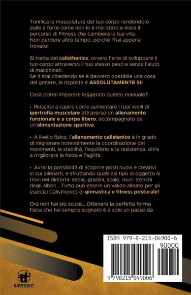 Hai sempre sognato di trovare uno sport che unisca divertimento, benessere mentale, e potenziamento di forza, resistenza ed equilibrio? Non perdere altro tempo, perché l'hai appena trovato! Si tratta del calisthenics, ovvero l'arte di sviluppare il tuo corpo attraverso il tuo stesso peso e senza l'aiuto di macchinari. Tonifica la muscolatura del tuo corpo rendendolo agile e forte come non lo è mai stato e inizia il percorso di Fitness che cambierà la tua vita. Se ti stai chiedendo se è davvero possibile una cosa del genere, la risposta è ASSOLUTAMENTE SI! Attraverso la lettura di questo libro sarai in grado di migliorare la tua fisicità allenandoti in casa, sia che tu abbia bisogno di dimagrire, sia che tu voglia semplicemente ridefinire il tuo corpo! Cosa potrai imparare leggendo questo manuale? Riuscirai a capire come aumentare i tuoi livelli di ipertrofia muscolare attraverso un allenamento funzionale e a corpo libero, accompagnato da un'alimentazione sportiva. A livello fisico, l'allenamento calistenico è in grado di migliorare notevolmente la coordinazione dei movimenti, la stabilità, l'equilibrio e la resistenza, oltre a migliorare la forza e l'agilità. Il contenuto del libro ti farà assumere più consapevolezza e padronanza del tuo corpo grazie alle spiegazioni degli esercizi e le numerose immagini che li riproducono alla perfezione. Dopo aver letto l'ultima pagina del manuale, conoscerai ogni segreto di questo sport e riuscirai ad adattare ogni esercizio alla tua routine quotidiana per integrarlo nel tuo giorno-dopo-giorno. Avrai la possibilità di scoprire posti nuovi e creativi in cui allenarti, e sfruttando qualsiasi tipo di oggetto si trovi nei dintorni: Sedie, gradini, scale, muri, tronchi degli alberi… Tutto può essere un valido alleato per gli esercizi Calisthenics di ginnastica e fitness posturale! Ora non hai più scuse… Ottenere la perfetta forma fisica che hai sempre sognato è a solo un passo da te!