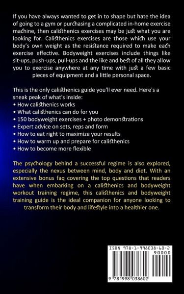 If you have always wanted to get in to shape but hate the idea of going to a gym or purchasing a complicated in-home exercise machine, then calisthenics exercises may be just what you are looking for. Calisthenics exercises are those which use your body's own weight as the resistance required to make each exercise effective. Bodyweight exercises include things like sit-ups, push-ups, pull-ups and the like and best of all they allow you to exercise anywhere at any time with just a few basic pieces of equipment and a little personal space. This is the only calisthenics guide you'll ever need. Here's a sneak peak of what's inside:How calisthenics works What calisthenics can do for you 150 bodyweight exercises + photo demonstrations Expert advice on sets, reps and form How to eat right to maximize your results How to warm up and prepare for calisthenics How to become more flexible The psychology behind a successful regime is also explored, especially the nexus between mind, body and diet. With an extensive bonus faq covering the top questions that readers have when embarking on a calisthenics and bodyweight workout training regime, this calisthenics and bodyweight training guide is the ideal companion for anyone looking to transform their body and lifestyle into a healthier one.