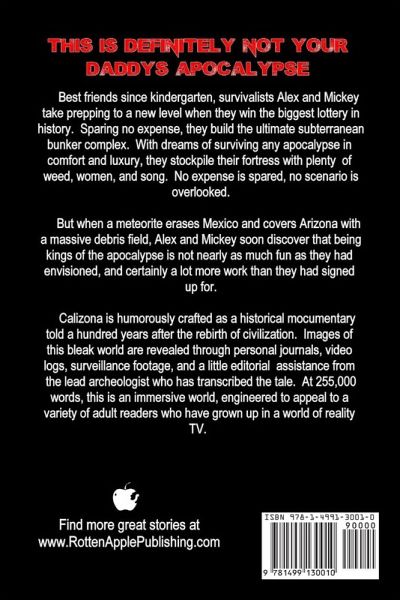 Best friends since kindergarten, survivalists Alex and Mickey take prepping to a new level when they win the biggest lottery in history. Sparing no expense, they build the ultimate subterranean bunker complex. With dreams of surviving the apocalypse in comfort and luxury, they stockpile their fortress with plenty of weed, women, and song. No expense is spared, no scenario is overlooked. But when a meteorite erases Mexico and covers Arizona with a massive debris field, Alex and Mickey soon discover that being kings of the apocalypse is not nearly as much fun as they had envisioned, and certainly a lot more work than they had signed up for. Calizona is humorously crafted as a historical mocumentary told a hundred years after the rebirth of civilization. Images of this bleak world are revealed through personal journals, video logs, surveillance footage, and a little editorial assistance from the lead archaeologist who has transcribed the tale. At 255,000 words, this is an immersive world, engineered to appeal to a variety of adult readers who have grown up in a world of reality TV.