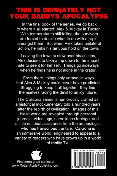 In the final book of the series, we go back to where it all started: Alex & Mickey in Tucson. With temperatures still falling, the survivors are forced to decide what to do with a rapist amongst them. But when Alex takes unilateral action, he risks his tenuous hold on the town. Leaving the town to stew over his actions, Alex decides to take a trip down to the impact site to see it for himself. Things go sideways when he finds he is not alone in the crater. From there, things only unravel in ways that Alex & Mickey could never have predicted. Struggling to keep it all together, they find themselves racing the devil to an icy future. Written as a historical mockumentary a hundred years after the rebirth of civilization, Calizona gives the reader a granular view into the life of a citizen struggling to survive in the weeks and months following an extinction level event.