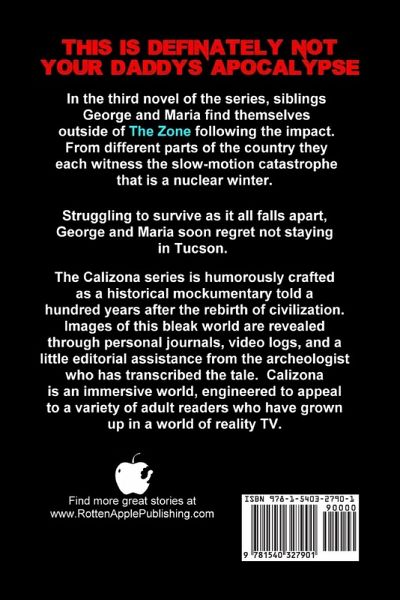 In the third novel of the series, Siblings George and Maria find themselves outside of the zone following the impact. From different parts of the country they each witness the slow motion catastrophe that is a nuclear winter. Struggling to survive as it all falls apart, they soon regret not staying in Tucson. The Calizona series is humorously crafted as a mockumentary told a hundred years after the rebirth of civilization. Images of this bleak world are revealed through personal journals, video logs, surveillance footage, and a little editorial assistance from the archaeologist who has transcribed the tale. Calizona is an immersive world, engineered to appeal to a variety of readers who have grown up in a world of reality TV.