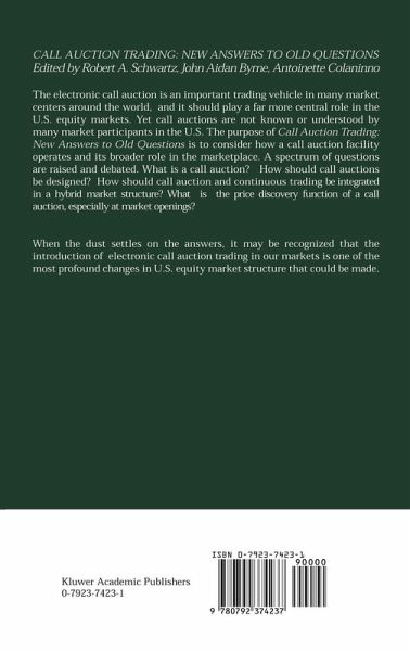This book is based on the proceedings of The Electronic Call Auction: New Answers to Old Questions, a conference hosted by the Zicklin School of Business on May 16, 2000. The text includes the edited transcripts of the panel discussions and separate addresses by three major industry executives Douglas M. Atkin, formerly President and CEO, Instinet Corporation; Kenneth D. Pasternak, formerly President and CEO, Knight/Trimark Group, Inc., and William J. Brodsky, Chairman and CEO, Chicago Board Options Exchange. The electronic call auction is an important trading vehicle in many market centers around the world, but is not well understood in the US. What are call auctions? How should they be designed and integrated with continuous trading in a hybrid market structure? As call auctions play a more central role in the US markets, how will they affect market quality in terms of transparency, order flow consolidation, and price discovery? These and other critical questions were asked at the conference while the efficiency of the US markets was broadly assessed.