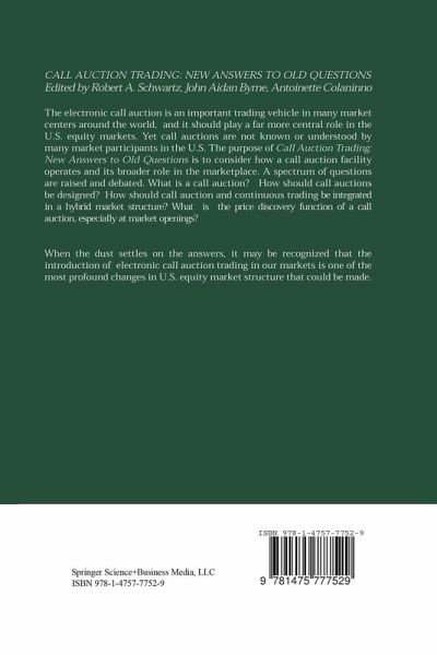 This book is based on the proceedings of The Electronic Call Auction: New Answers to Old Questions, a conference hosted by the Zicklin School of Business on May 16, 2000. The text includes the edited transcripts of the panel discussions and separate addresses by three major industry executives Douglas M. Atkin, formerly President and CEO, Instinet Corporation; Kenneth D. Pasternak, formerly President and CEO, Knight/Trimark Group, Inc., and William J. Brodsky, Chairman and CEO, Chicago Board Options Exchange. The electronic call auction is an important trading vehicle in many market centers around the world, but is not well understood in the US. What are call auctions? How should they be designed and integrated with continuous trading in a hybrid market structure? As call auctions play a more central role in the US markets, how will they affect market quality in terms of transparency, order flow consolidation, and price discovery? These and other critical questions were asked at the conference while the efficiency of the US markets was broadly assessed.