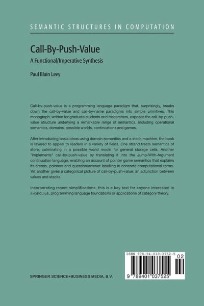 I Language.- 1. Call-By-Value and Call-By-Name.- 2. Call-By-Push-Value: A Subsuming Paradigm.- 3. Complex Values and Equational Theory.- 4. Recursion and Infinitely Deep CBPV.- II Concrete Semantics.- 5. Simple Models of CBPV.- 6. Possible World Model for Cell Generation.- 7. Jump-With-Argument.- 8. Pointer Games.- III Categorical Semantics.- 9. Semantics in Element Style.- 10. All Models are Categorical Models.- 11. Representing Objects.- IV Conclusions.- 12. Conclusions, Comparisons and Further Work.- Appendices.- Technical Treatment of CBV and CBN.- A.1 The Jumbo ?-Calculus.- A.1.1. Introduction.- A.1.2. Tuple Types.- A.1.3. Function Types.- A.2 Languages and Tranlations.- A.3 Call-By-Value.- A.3.1. Coarse-Grain Call-By-Value.- A.3.2. Fine-Grain Call-By-Value.- A.3.3. From CG-CBV To FG-CBV.- A.4 Call-By-Name.- A.5 The Lazy Paradigm.- A.6 Subsuming FG-CBV and CBN.- A.6.1 From FG-CBV to CBPV.- A.6.2 From CBPV Back to FG-CBV.- A.6.3 From CBN to CBPV.- A.6.4 From CBPV back To CBN.- Models In The Style Of Power-Robinson.- B.1 Intoduction.- B.2 Actions of Monoidal Categories.- B.3 Freyd Categories.- B.4 Judgement Model.- B.5 Enrichment.- B.6 Connectives.- B.7 Modelling CBPV.- B.8 The Full Reflection.- B.9 Theories.- B.10 Conservativity.- References.