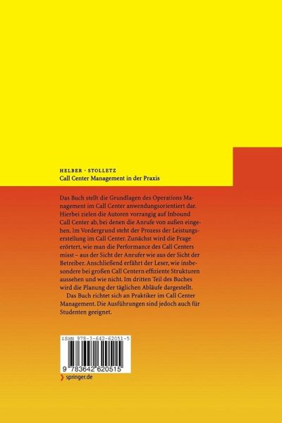 Das Buch stellt die Grundlagen des Operations Management im Call Center anwendungsorientiert dar. Hierbei zielen die Autoren vorrangig auf Inbound Call Center ab, bei denen die Anrufe von außen eingehen. Im Vordergrund steht der Prozess der Leistungserstellung im Call Center. Zunächst wird die Frage erörtert, wie man die Performance des Call Centers misst - aus der Sicht der Anrufer wie aus der Sicht der Betreiber. Anschließend erfährt der Leser, wie insbesondere bei großen Call Centern effiziente Strukturen aussehen und wie nicht. Im dritten Teil des Buches wird die Planung der täglichen Abläufe dargestellt.