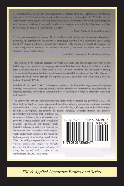 This volume gives language teachers, software designers, and researchers who wish to use technology in second or foreign language education the information they need to absorb what has been achieved so far and to make sense of it. It is designed to enable the kind of critical reading of a substantial literature that leads to a balanced and detailed knowledge of the field. Chapter by chapter, the book builds, through description, analysis, examples, and discussion, a detailed picture of modern CALL. In this book, the label ?CALL? is interpreted broadly to include technology-enhanced language learning, Web-enhanced language learning, and information and communication technologies for language learning. The work is distinguished by its attention to a range of languages rather than just English. The authors first set the scene and introduce major areas of interest and growth in CALL, and then look in depth at seven important dimensions: design, evaluation, computer-mediated communication, theory, research, practice, and technology. Chapters on each of these topics include a description that reviews the recent literature, identifies themes, and presents representative projects that illustrate the dimension, followed by a discussion that provides in-depth analysis, and a conclusion offering suggestions for further work. Detailed references and links connect the description and discussion with original works and primary sources so the reader can follow up easily on areas of personal interest. Two concluding chapters discuss how the various dimensions might be brought together, the first from a practical point of view, the second with a view to the development of CALL as a whole.