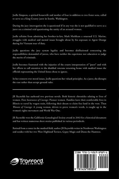 Joella Simpson, a spirited housewife and mother of four in additions to two foster sons is called to serve as a King County juror in Seattle Washington. During the jury interrogation she is questioned if in any way she is not qualified to serve as a juror on the criminal trial questioning the sanity of the accused woman. Joella refrains from admitting her brother- in-law, Mark Markham a returned US Marine struggles with medical and mental issues brought about by his exposure to Agent Orange during his Vietnam tour of duty. Joella questions the jury system legality and becomes disillusioned concerning the responsibilities demanded of jurors, who have neither the experience nor education to judge the merits of criminals. Joella becomes frustrated with the injustice of the courts interpretation of "peers." and with her efforts to call attention to the disabled veterans returning home medical issues the officials representing the United States chose to ignore. Joella finds herself questioning her principles, in her concern over moral issues. She, as a juror, disrupts the case rather than accept ground rules.