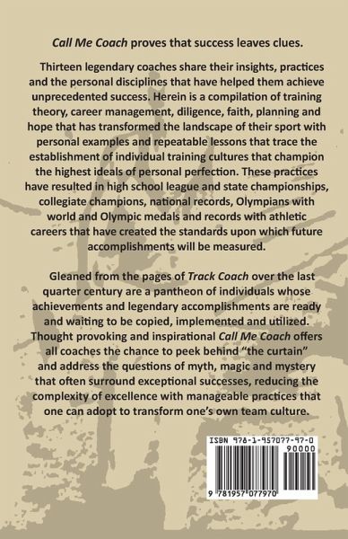 Call Me Coach proves that success leaves clues. Thirteen legendary coaches share their insights, practices and the personal disciplines that have helped them achieve unprecedented success. Herein is a compilation of training theory, career management, diligence, faith, planning and hope that has transformed the landscape of their sport with personal examples and repeatable lessons that trace the establishment of individual training cultures that champion the highest ideals of personal perfection. These practices have resulted in high school league and state championships, collegiate champions, national records, Olympians with world and Olympic medals and records with athletic careers that have created the standards upon which future accomplishments will be measured. Gleaned from the pages of Track Coach over the last quarter century are a pantheon of individuals whose achievements and legendary accomplishments are ready and waiting to be copied, implemented and utilized. Thought provoking and inspirational Call Me Coach offers all coaches the chance to peek behind "the curtain" and address the questions of myth, magic and mystery that oft en surround exceptional successes, reducing the complexity of excellence with manageable practices that one can adopt to transform one's own team culture.