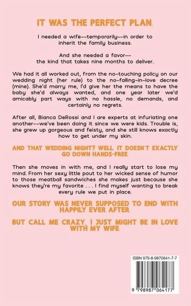 It was the perfect plan. I needed a wife--temporarily--in order to inherit the family business. And she needed a favor--the kind that takes nine months to deliver. We had it all worked out, from the no-touching policy on our wedding night (her rule) to the no-falling-in-love decree (mine). She'd marry me, I'd give her the means to have the baby she'd always wanted, and one year later we'd amicably part ways with no hassle, no demands, and certainly no regrets. After all, Bianca DeRossi and I are experts at infuriating one another--we've been doing it since we were kids. Trouble is, she grew up gorgeous and feisty, and she still knows exactly how to get under my skin. And that wedding night? Well, it doesn't exactly go down hands-free. Then she moves in with me, and I really start to lose my mind. From her sexy little pout to her wicked sense of humor to those meatball sandwiches she makes just because she knows they're my favorite . . . I find myself wanting to break every rule we put in place. Our story was never supposed to end with happily ever after. But call me crazy, I just might be in love with my wife.