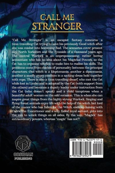 "Call Me Stranger" is an escapist fantasy concerns a time-travelling Cat trying to save his previously Good witch after she was misled into becoming Bad. The scenarios cover present day, North Yorkshire and the Tyneside of a thousand years ago. The central Warlock is an unprepossessing, rather boring accountant who has no idea about his Magickal Powers, so the Cat has to organise witches to make him to realise his skills. The problems come from clashes of personality between the principal characters. One witch is a kleptomania, another a dipsomania, another a smelly gypsy medium in a sacking dress held together with rope. There is also a time travelling dwarf, who met the Cat while lost in Limbo and is adopted by the Cat (with support from the others) and becomes a deputy leader under instruction from the Cat (who doesn't speak) and a child temptress when a beautiful adult woman on the odd occasion. This is when she can inspire great things from the highly strung Warlock. Singing and flying forest animals enjoy life with the help of the witch, but lord of the manor who has fallen for the Witch, ends up liaising with Cedric the Executioner and a wily, failed royal servant, gets into the mix to wreck things on all sides. By the way, "Magick" has extraordinary powers, whereas "magic" has not!!
