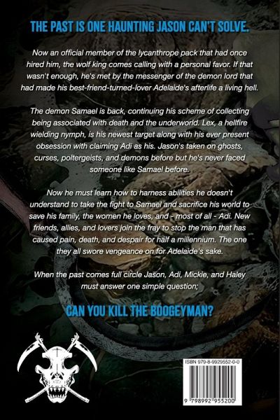The past is one haunting Jason can't solve. Now an official member of the lycanthrope pack that had once hired him, the wolf king comes calling with a personal favor. If that wasn't enough, he's met by the messenger of the demon lord that had made his best-friend-turned-lover Adelaide's afterlife a living hell. The demon Samael is back, continuing his scheme of collecting being associated with death and the underworld. Lex, a hellfire wielding nymph, is his newest target along with his ever present obsession with claiming Adi as his. Jason's taken on ghosts, curses, poltergeists, and demons before but he's never faced someone like Samael before. Now he must learn how to harness abilities he doesn't understand to take the fight to Samael and sacrifice his world to save his family, the women he loves, and - most of all - Adi. New friends, allies, and lovers join the fray to stop the man that has caused pain, death, and despair for half a millennium. The one they all swore vengeance on for Adelaid's sake. When the past comes full circle Jason, Adi, Mickie, and Haley must answer one simple question; Can you kill the boogeyman?