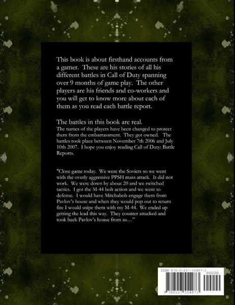 This book is about firsthand accounts from a gamer. These are his stories of all his different battles in Call of Duty spanning over 9 months of game play. The other players are his friends and co-workers and you will get to know more about each of them as you read each battle report.