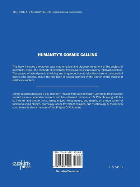 Written by James M. Essig and published by Outskirts Press, Call of the Cosmic Wild includes a relatively easy mathematical and visionary treatment of the subject of interstellar travel. The methods of interstellar travel covered include mainly relativistic rockets. The subject of astrodynamic shielding and drag reduction at velocities close to the speed of light is also covered. Call of the Cosmic Wild is the author's first book among several planned on the subject of relativistic rockets. James Essig has received a B.S. Degree in physics from George Mason University. He previously worked as an independent inventor and has obtained numerous U.S. Patents along with his co-inventor and brother John. James enjoys hiking, nature, and reading on a wide variety of topics including physics, cosmology, space travel technologies, and the theology of the human soul. James is also a member of the Knights of Columbus.