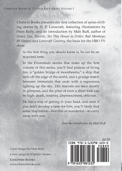 Chatwin Books presents our first collection of spine-chilling stories by H. P. Lovecraft featuring an introduction by Matt Ruff, author of Sewer, Gas, Electric; Set This House in Order; Bad Monkeys; 88 Names; and Lovecraft Country, the basis for the HBO TV show.So the first thing you should know is, he can be an acquired taste.In the Dreamlands stories that make up the first volume of this series, you'll find palaces of living fire, a "golden bridge of moonbeams," a ship that sails off the edge of the world, and a grudge match between immortals that ends with a supernova lighting up the sky...His marvels are seen mostly in glimpses, and the price of even a short look can be high: death, insanity, disensoulment, oblivion.He has a way of getting in your head, and even if you don't develop a taste for him, you'll likely find some inspiration-horrible or wonderful-to carry away with you. -from the introduction by Matt Ruff