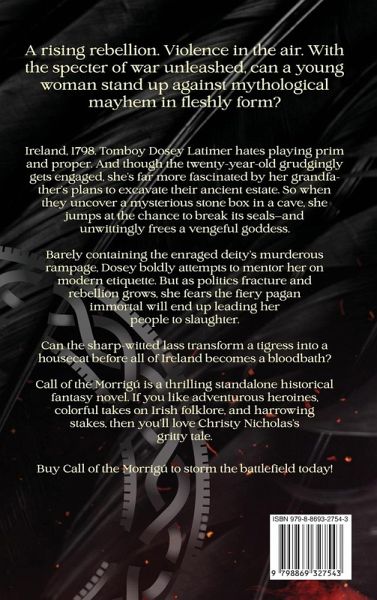 A rising rebellion. Violence in the air. With the specter of war unleashed, can a young woman triumph against mythological mayhem in fleshly form? Ireland, 1798. Tomboy Dosey Latimer hates playing prim and proper. Despite her reluctant engagement, her true passion lies with her grandfather's plans to excavate an ancient site on the estate. When they stumble upon an enigmatic stone box hidden in a sacred cave, Dosey's curiosity gets the best of her, and she breaks the seals that bind its ancient secrets-unleashing a vengeful goddess upon the world. Struggling to contain the fury of the wrathful deity, Dosey boldly takes on the role of mentor, teaching the volatile goddess the ways of the modern world. But as political tensions escalate and the flames of rebellion ignite, Dosey fears the fiery pagan immortal may lead her people to slaughter. Can the quick-witted young lady tame a tigress and avert a bloodbath that threatens to consume all of Ireland? Call of the Morrigú is a thrilling standalone historical fantasy, a tale that stands as a testament to courage and resilience. Join Dosey on her daring journey as she navigates treacherous betrayals, battles mythical forces, and confronts the harrowing consequences of her choices. Immerse yourself in the vivid world of Call of the Morrigú, where Irish folklore and high-stakes adventures collide. Christy Nicholas weaves a gritty and captivating tale that will leave you breathless. Read Call of the Morrigú to storm the battlefield today!