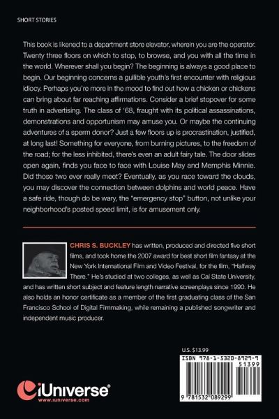 This book is likened to a department store elevator, wherein you are the operator. Twenty three floors on which to stop, to browse, and you with all the time in the world. Wherever shall you begin? The beginning is always a good place to begin. Our beginning concerns a gullible youth's first encounter with religious idiocy. Perhaps you're more in the mood to find out how a chicken or chickens can bring about far reaching affirmations. Consider a brief stopover for some truth in advertising. The class of '68, fraught with its political assassinations, demonstrations and opportunism may amuse you. Or maybe the continuing adventures of a sperm donor? Just a few floors up is procrastination, justified, at long last! Something for everyone, from burning pictures, to the freedom of the road; for the less inhibited, there's even an adult fairy tale. The door slides open again, finds you face to face with Louise May and Memphis Minnie. Did those two ever really meet? Eventually, as you race toward the clouds, you may discover the connection between dolphins and world peace. Have a safe ride, though do be wary, the "emergency stop" button, not unlike your neighborhood's posted speed limit, is for amusement only.