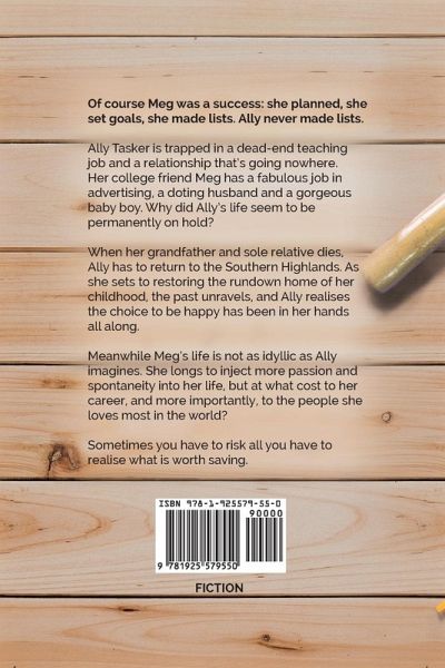 Of course Meg was a success: she planned, she set goals, she made lists. Ally never made lists. Ally Tasker is trapped in a dead-end teaching job and a relationship that's going nowhere. Her college friend Meg has a fabulous job in advertising, a doting husband and a gorgeous baby boy. Why did Ally's life seem to be permanently on hold? When her grandfather and sole relative dies, Ally has to return to the Southern Highlands. As she sets to restoring the rundown home of her childhood, the past unravels, and Ally realises the choice to be happy has been in her hands all along. Meanwhile Meg's life is not as idyllic as Ally imagines. She longs to inject more passion and spontaneity into her life, but at what cost to her career, and more importantly, to the people she loves most in the world? Sometimes you have to risk all you have to realise what is worth saving.