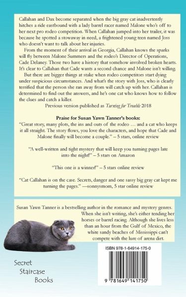 Callahan and Dax become separated when the big gray cat inadvertently hitches a ride eastbound with a lady barrel racer named Malone who's off to her next pro rodeo competition. When Callahan jumped into her trailer, it was because he spotted a stowaway in need, a frightened young teen named Joss who doesn't want to talk about her injuries. From the moment of their arrival in Georgia, Callahan knows the sparks will fly between Malone Summers and the rodeo's Director of Operations, Cade Delaney. Those two have a history that somehow involved broken hearts. It's clear to Callahan that Cade wants a second chance and Malone isn't willing. But there are bigger things at stake when rodeo competitors start dying under suspicious circumstances. And what's the story with Joss, who is clearly terrified that the person she ran away from will catch up with her. Callahan is determined to find out the answers, and he's one cat who knows how to follow the clues and catch a killer. Previous version published as Turning for Trouble 2018 Praise for Susan Yawn Tanner's books: "Great story, many plots, the ins and outs of the rodeo ... and a cat who keeps it all straight. The story flows, you love the characters, and hope that Cade and Malone finally will become a couple." - 5 stars, online review "A well-written and tight mystery that will keep you turning pages late into the night!" - 5 stars on Amazon "This one is a winner!" - 5 stars online review