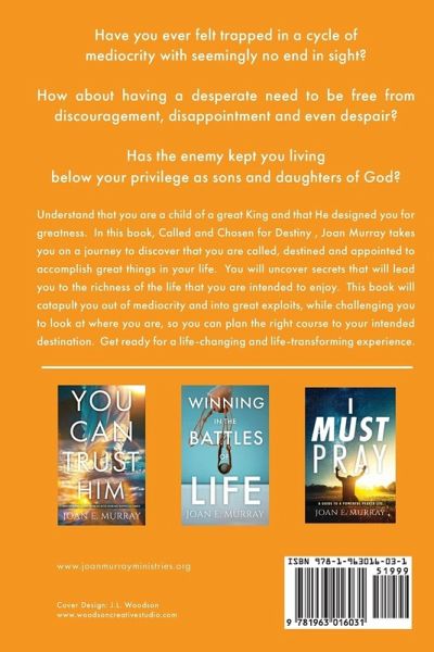 Have you ever felt trapped in a cycle of mediocrity with seemingly no end in sight? How about having a desperate need to be free from discouragement, disappointment, and even despair? Has the enemy kept you living below your privilege as sons and daughters of God? ¿¿¿Understand that you are a child of a great King and that He designed you for greatness. ¿¿In this book, Called and Chosen for Destiny, Joan Murray takes you on a journey to discover that you are called, destined, and appointed to accomplish great things in your life. You will uncover secrets that will lead you to the richness of the life that you are intended to enjoy. This book will catapult you out of mediocrity and into great exploits while challenging you to look at where you are so you can plan the right course to your intended destination. ¿Get ready for a life-changing and life-transforming experience.