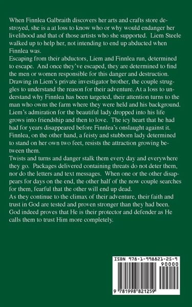 When Finnlea Galbraith discovers her arts and crafts store destroyed, she is a at loss to know who or why would endanger her livelihood and that of those artists who she supported. Liem Steele walked up to help her, not intending to end up abducted when Finnlea was.Escaping from their abductors, Liem and Finnlea run, determined to escape. And once they've escaped, they are determined to find the men or women responsible for this danger and destruction.Drawing in Liem's private investigator brother, the couple struggles to understand the reason for their adventure. At a loss to understand why Finnlea has been targeted, their attention turns to the man who owns the farm where they were held and his background.Liem's admiration for the beautiful lady dropped into his life grows into friendship and then to love. The icy heart that he had had for years disappeared before Finnlea's onslaught against it. Finnlea, on the other hand, a feisty and stubborn lady determined to stand on her own two feet, resists the attraction growing between them.Twists and turns and danger stalk them every day and everywhere they go. Packages delivered containing threats do not deter them, nor do the letters and text messages. When one disappears for days on the end, the other half of the now couple searches for them, fearful that the other will end up dead.As they continue to the climax of their adventure, their faith and trust in God are tested and proven stronger than they had been. God indeed proves that He is their protector and defender as He calls them to trust Him more completely.