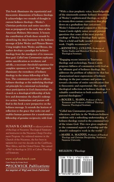 Description: This book illuminates the experiential and theocentric dimensions of holiness theology. It acknowledges two strands of thought in current holiness theology--Wesley's Christian perfection and entire sanctification as propagated in the early days of the American Holiness Movement. It honors the contribution of both these strands by identifying the deep harmony in the holiness message of John Wesley and Phineas Bresee. Using insights from Wesley and Bresee, the author develops a paradigm for holiness theology from the standpoint of its transcendent goal. Called into Communion explicates entire sanctification as revelatory and salvific, a necessary threshold experience for complete openness to God. This approach illuminates the rootedness of holiness theology in the triune fellowship of holy love. The communion perspective affirms holiness theology as the underlying theological principle for a missional ecclesiology since participation in God characterizes the church as a doxological fellowship of holy love and determines the church's redemptive action. Seminarians and pastors will find in this book a new perspective on the holiness message. It extends the horizon of reflection to the grace that seeks out and enables human partners for a transformative fellowship of genuine reciprocity with God. Endorsements: ""With a clear prophetic voice, knowledgeable of the nineteenth-century holiness distortions of Wesley's sophisticated theology, as well as its twenty-first-century correctives that plop down on a gradualism that caricatures Wesley's balanced and conjunctive theology, Susan Carole rightly raises several pointed questions that some of the most popular readings of Wesley's theology flatly ignore. This is a bold and badly needed courageous work. I highly recommend it."" --Kenneth J. Collins, Professor of Wesley Studies and Historical Theology, Asbury Theological Seminary ""Engaging recent interest in Trinitarian theology and ecclesiology, Susan Carole proposes fullness of communion with God as the ultimate goal of holiness theology. She addresses the problem of subjectivity that has characterized most expressions of holiness theology in the past century and points us toward a doctrine of entire sanctification that is theocentric and experiential. Her careful theological reflection on holiness theology is a valuable contribution to both academic and pastoral theologians."" --Roger L. Hahn, Professor of New Testament and Professor of Biblical Theology, Nazarene Theological Seminary ""Called into Communion provides pastors, educators, and laity in the Wesleyan-holiness tradition with a refreshing understanding of holiness theology rooted in the communal love of the triune God. This view gives emphasis to the communal aspects of worship and the church's redemptive work in the world."" --Mark A. Maddix, Professor of Practical Theology and Christian Discipleship, Northwest Nazarene University About the Contributor(s): Susan Carole is adjunct professor of theology at Nazarene Theological Seminary and instructor in the Nazarene Clergy Development Program. An ordained minister in the Church of the Nazarene, she has been in ministry for over two decades in the Caribbean, West Africa, and the United States. She earned a PhD in theology in 2011 at Calvin Theological Seminary.
