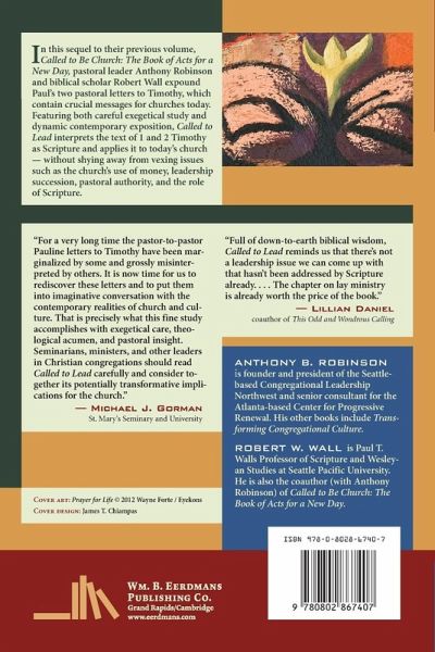 Following up on their previous volume, Called to Be Church: The Book of Acts for a New Day, biblical scholar Robert Wall and pastoral leader Anthony Robinson here join forces again. Featuring both exegetical study and dynamic contemporary exposition, each chapter of Called to Lead first interprets the text of 1 and 2 Timothy as Scripture and then engages 1 and 2 Timothy for today's church leaders. The book covers many vexing issues faced by church leaders then and now -- such issues as the use of money, leadership succession, pastoral authority, and the role of Scripture. Through it all, Called to Lead shows how Timothy remains a text of great value for the church today