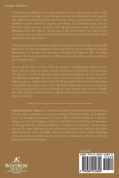 We have been called by God for the salvation of our souls, in order to live a life surrendered in worship of God; but also to have a productive life in all aspects. The child of God has been rescued from the world, transformed by God, and enabled to serve Christ, his church, and others. The Christian must dedicate his entire life to service. Therefore, serving must be one of the most beautiful obligations that the believer can develop in this world. When the child of God serves the Lord and other people, he can find purpose in his life and live with a satisfaction that lasts forever. Many Christians are consumers and not reproducers, that is, they continually need to be carried and supported since they have not grown enough to support themselves. So, we must ask ourselves, why does this happen? Why are many people in the local church inactive? Why do many Christians not know what to do with their lives? This book has been written with the purpose of helping the child of God know why he is here on earth, and how he can live a productive life in Christ. The objective of this book is to prepare and train children of God who have recently been baptized and who want to serve God, but do not know how or where to do so. Additionally, it tries to fill the need of those pastors who have new people who want to serve God. Therefore, this book can serve as material for the preparation of male and female servants for the work of God. Finally, the child of God will learn that his calling will be realized by serving in a local Church ministry.