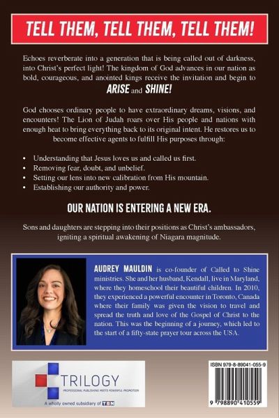 Tell them, tell them, tell them! Echoes reverberate into a generation that is being called out of darkness, into Christ's perfect light! The kingdom of God advances in our nation as bold, courageous, and anointed kings receive the invitation and begin to ARISE and SHINE! God chooses ordinary people to have extraordinary dreams, visions, and encounters! The Lion of Judah roars over His people and nations with enough heat to bring everything back to its original intent. He restores us to become effective agents to fulfill His purposes through: Understanding that Jesus loves us and called us first. Removing fear, doubt, and unbelief. Setting our lens into new calibration from His mountain. Establishing our authority and power. Our nation is entering a new era. Sons and daughters are stepping into their positions as Christ's ambassadors, igniting a spiritual awakening of Niagara magnitude.