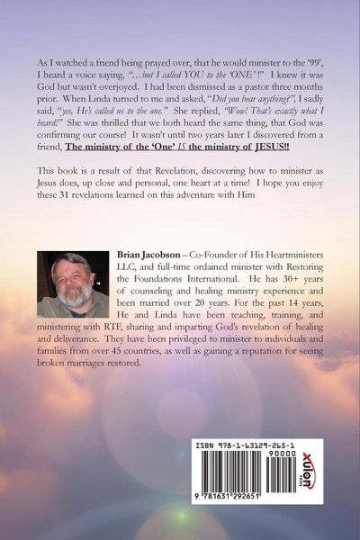 As I watched a friend being prayed over, that he would minister to the '99', I heard a voice saying, "...but I called YOU to the 'ONE' !" I knew it was God but wasn't overjoyed. I had been dismissed as a pastor three months prior. When Linda turned to me and asked, "Did you hear anything?", I sadly said, "yes, He's called us to the one." She replied, "Wow! That's exactly what I heard!" She was thrilled that we both heard the same thing, that God was confirming our course! It wasn't until two years later I discovered from a friend, The ministry of the 'One' IS the ministry of JESUS!! This book is a result of that Revelation, discovering how to minister as Jesus does, up close and personal, one heart at a time! I hope you enjoy these 31 revelations learned on this adventure with Him Brian Jacobson - Co-Founder of His Heartministers LLC, and full-time ordained minister with Restoring the Foundations International. He has 30+ years of counseling and healing ministry experience and been married over 20 years. For the past 14 years, He and Linda have been teaching, training, and ministering with RTF, sharing and imparting God's revelation of healing and deliverance. They have been privileged to minister to individuals and families from over 45 countries, as well as gaining a reputation for seeing broken marriages restored.