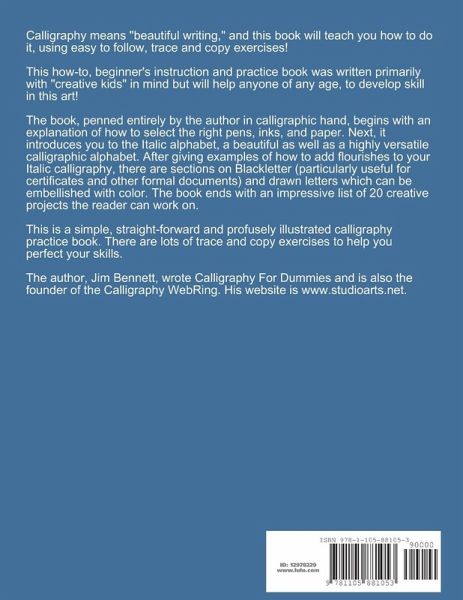 Calligraphy means "beautiful writing," and this book will show you how to do it. All you have to do is follow the easy, trace and copy examples! This how-to, beginner's instruction book is written mainly with "creative kids" in mind (age 10 and up) but will help anyone of any age to develop skill in this art! The book, penned entirely in a calligraphic hand, begins with an explanation of how to select the right pens, inks, and paper. Next, it introduces you to the Italic alphabet, a beautiful and highly versatile alphabet. After that, there are sections on Blackletter (particularly useful for certificates) and drawn letters. The book ends with an impressive list of creative projects the reader can work on. This is a simple, straight-forward and profusely illustrated calligraphy practice book. The author, Jim Bennett, wrote Calligraphy For Dummies and is also the founder of the Calligraphy WebRing. His website is www.studioarts.net.
