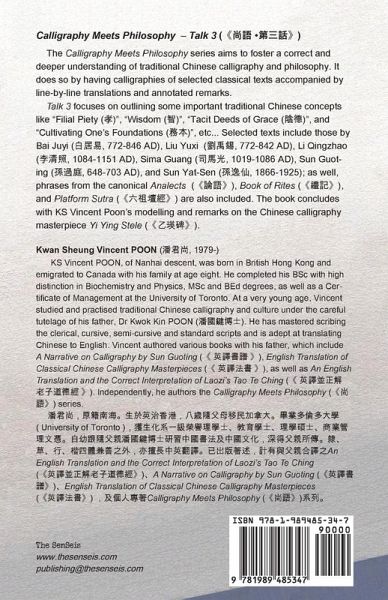 Calligraphy Meets Philosophy - Talk 3 Introduction (I) The Calligraphy Meets Philosophy series aims to foster a correct and deeper understanding of traditional Chinese calligraphy and philosophy. It does so by having calligraphies of selected classical texts accompanied by line-by-line translations and annotated remarks. (II) Talk 3 focuses on outlining some important traditional Chinese concepts like "Filial Piety (¿)", "Wisdom (¿)", "Tacit Deeds of Grace (¿¿)", and "Cultivating One's Foundations (¿¿)", etc... Selected texts include those by Bai Juyi (¿¿¿, 772-846 AD), Liu Yuxi (¿¿¿, 772-842 AD), Li Qingzhao (¿¿¿, 1084-1151 AD), Sima Guang (¿¿¿, 1019-1086 AD), Sun Guoting (¿¿¿, 648-703 AD), and Sun Yat-Sen (¿¿¿, 1866-1925); as well, phrases from the canonical Analects (¿¿¿¿), Book of Rites (¿¿¿¿), and Platform Sutra (¿¿¿¿¿¿) are also included. The book concludes with KS Vincent Poon's modelling and remarks on the Chinese calligraphy masterpiece Yi Ying Stele (¿¿¿¿¿). (III) Here, I would like to thank my father, Dr Kwok Kin POON (¿¿¿¿¿), for his enduring assistance. His invaluable insight on correctly interpreting various old texts has contributed significantly to my translations. Further, his continuing encouragement has always been the source of my passion. Perhaps this is a prime example of "passing on (¿¿) the family's profession and reputation (¿¿)", a custom that the Japanese hold so dearly. And that is exactly why Japan can still retain its traditional culture and values. KS Vincent Poon August 2024, Toronto